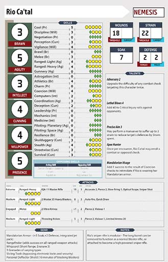 Rio is skilled in several forms of combat, and can hold her own with a pair of daggers or pistols just fine. She has a full suite of Mandalorian gadgets as well. But nothing is more precious to her than her custom made sniper rifle. Her accuracy is downright deadly, and the rifle is powerful enough to make every shot count.