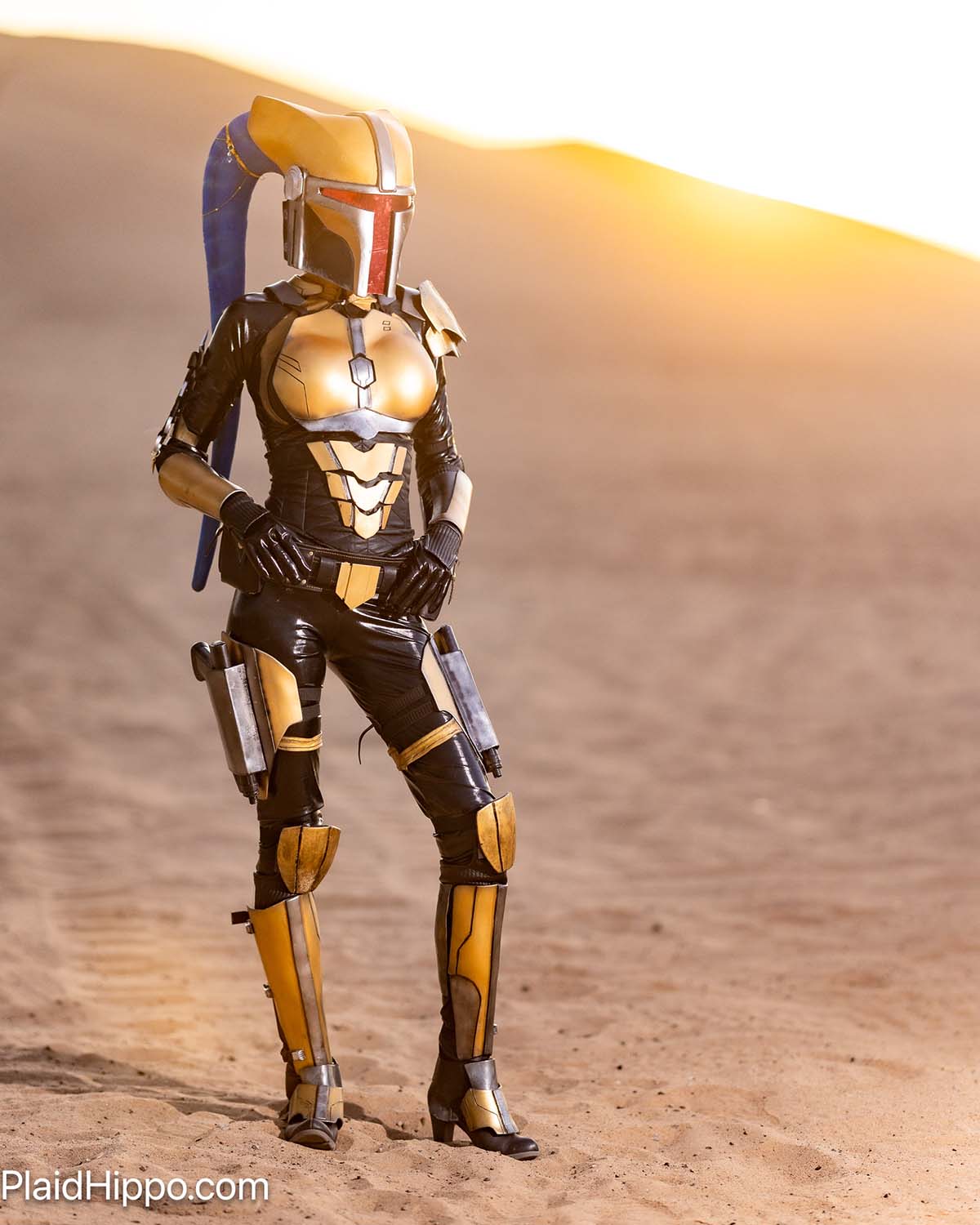 This means it’s a lot less covering than others – it’s a set of armor built as much for looks as it is for function. With it’s bright gold beskar and dark silver accents, all layered on top of a laminated compression suit… Rio’s armor strikes a very noticeable, very memorable appearance.